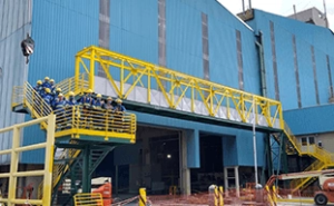 Passarela dimensionada para instalação no tempo, considerando as cargas estáticas devido a ação do vento, com emissão de ART e laudo NR12. Vão entre colunas de 22 metros.
