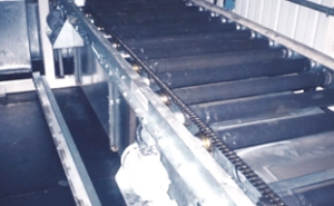 Fornecimento Turnkey de transportador de roletes para planta fabricante de freezer. Transportador funciona com acúmulo das cargas. Roletes emborrachados acionados por corrente.